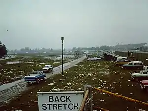 Though the new garages were universally praised for their increased space and function, they were criticized for lack of aesthetics, and for breaking tradition.[11] The plain precast concrete walls resembled the cookie-cutter stadiums of the era that were largely criticized in baseball and football. The design was a sharp and striking contrast to the previous garage complex, which led some to call them overtly plain or "antiseptic."[12] Changing the layout to north–south based was also a thinly-veiled attempt by the management to further scale back the oft-rowdy "Snakepit" area formerly located inside the turn one infield. The interiors were spacious and without walls (except those adjacent to the middle corridors), allowing teams the flexibility to erect partitions as they saw fit, as well as layout their work area however they desired. Lastly, the new complex greatly improved safety. The old wooden buildings were criticized as potential "fire traps,"[13] and management did not want a repeat of the devastating 1941 fire. The concrete construction was more fire-resistant, water spigots were provided in every stall, and the wider lanes provided easier fire escape.
