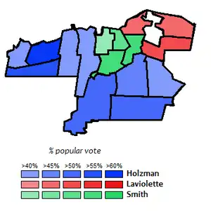 Holzman's victory was propelled by winning the city's suburban wards, with her best ward being Richmond, which she had represented on council. Smith won the city's four urban wards, doing her best in St. George's, which she had represented on council. Laviolette won the city's two Francophone-influenced eastern wards.[4]