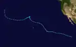 Tropical Storm Enrique formed in the eastern Pacific basin, where it reached its peak intensity as a category 1 Hurricane, becoming Hurricane Enrique. Enrique lasted for several days drifting north of the Hawaiian Islands as a weak system.[4][5][6] As Enrique approached the International Dateline, the system started to redevelop. Shortly after crossing the dateline, Enrique became a tropical storm again on August 1. It lasted for less than 24 hours before strong upper-level wind shear dissipated its convection, exposing the cyclone's circulation.[7] No damages or casualties were caused by Enrique.[6][7][8] It is one of only eight tropical cyclones to exist in all three tropical cyclone basins in the Pacific Ocean.[7] The others are 1986's Georgette,[9] 1994's Li and John, 1999's Dora, 2014's Genevieve, 2018's Hector and 2023's Dora.
