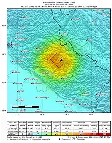 The 1991 Uttarkashi earthquake (also known as the Garhwal earthquake) occurred at 02:53:16 Indian Standard Time (UTC+05:30) on 20 October with a moment magnitude of 6.8 and a maximum Mercalli intensity of IX (Violent). This thrust event was instrumentally recorded and occurred along the Main Central Thrust in the Uttarkashi and Gharwal regions of the Indian state of Uttarakhand (then still part of Uttar Pradesh). High intensity shaking resulted in the deaths of at least 768 people and the destruction of thousands of homes.