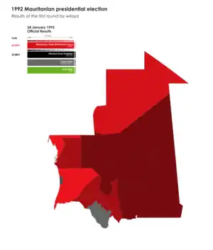 Presidential elections were held in Mauritania on 24 January 1992. They followed the constitutional referendum the previous year that resulted in the reintroduction of multi-party democracy, and were the first presidential elections to feature more than one candidate. The result was a victory for incumbent President Maaouya Ould Sid'Ahmed Taya of the Democratic and Social Republican Party, who defeated three other candidates with 62.9% of the vote.[1] Voter turnout was just 47.4%.[2]
