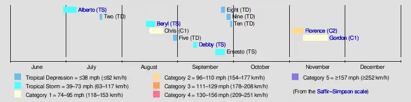 The 1994 Atlantic hurricane season was the final season in the most recent negative Atlantic multidecadal oscillation period ("low-activity era" or "cold phase") of tropical cyclone formation within the basin. The season produced seven named tropical cyclones and three hurricanes, a total well below the seasonal average. The season officially started on June 1 and ended on November 30, dates which conventionally limit the period each year when most tropical cyclones tend to form in the Atlantic Ocean. The first tropical cyclone, Tropical Storm Alberto, developed on June 30, while the last storm, Hurricane Gordon, dissipated on November 21. The season was unusual in that it produced no major hurricanes, which are those of Category 3 status or higher on the Saffir–Simpson hurricane scale. The most intense hurricane, Hurricane Florence, peaked as a Category 2 storm with winds of 110 mph (180 km/h).