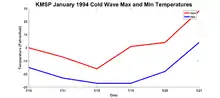 The 1994 North American cold wave occurred over the midwestern and eastern regions of the United States and southern Canada in January 1994. The cold wave caused over 100 deaths in the United States. Two notable cold air events took place from January 18–19 and January 21–22. There were 67 minimum temperature records set on January 19.[1] During this time, much of the United States experienced its coldest temperatures since a major storm on February 20, 1934.