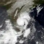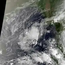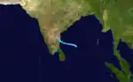 A low-pressure area formed over the western Bay of Bengal on October 28. On the next day, the IMD classified it as a depression, and soon upgraded it to a deep depression. On October 30, the IMD upgraded it further to a cyclonic storm and later a severe cyclonic storm, estimating peak 3–minute winds of 110 km/h (70 mph); this was based on the appearance of a well-defined eye. Also on October 30, the JTWC initiated advisories on the system as Tropical Cyclone 04B north of Sri Lanka. The storm consisted of a consolidating area of thunderstorms, with spiral rainbands. Steered by a ridge to the north, the system moved west-northwestward toward the southeast coast of India. Early on October 31, the storm made landfall in southeastern India near Chennai with winds of 110 km/h (70 mph), according to the IMD, and 85 km/h (55 mph) according to the JTWC. Late on October 31, the storm fell below depression status after weakening over land.[2][1]