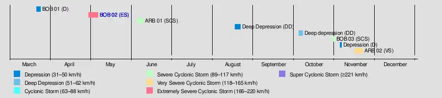 BOB 02April 26 – May 2Extremely Severe Cyclonic Storm215 km/h (135 mph)940 hPa (27.76 inHg)Bangladesh, Myanmar125 million350