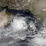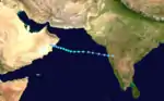 After the annual monsoon moved across India, a thermal low developed in early June over Maharashtra in west-central India. Steered by the flow of the monsoon, the low moved offshore and tracked generally west-northwestward, bringing heavy rainfall and gusty winds to the coast. Ratnagiri, Maharashtra reported sustained winds of 74 km/h (46 mph). The IMD classified the low as a depression late on June 5, and upgraded it further to a cyclonic storm the next day. On June 7, the JTWC initiated advisories on the system, designating it Tropical Cyclone 03A and estimating peak winds of 85 km/h (55 mph). On the same day, the IMD upgraded the system to a severe cyclonic storm, estimating peak winds of 100 km/h (60 mph). The storm weakened as it continued across the northern Arabian Sea. By June 9, the storm had weakened to a depression, and that day it passed near Masirah Island before moving over eastern Oman. The circulation dissipated soon after, but the remnants of the storm continued westward into Yemen. Along the Arabian Peninsula, the cyclone produced dust storms but little rainfall.[1][2][5]