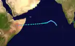 The JTWC began monitoring an area of thunderstorms on November 13 in the south-central Arabian Sea. A day later, the system organized into a low-pressure area, before developing into a depression on November 15, as classified by the IMD. On the same day, the JTWC classified the system as Tropical Cyclone 05A. The system moved slowly at first before beginning a general westward motion, steered by a ridge to the north. Convection organized around the center, signaling intensification. On November 16, the IMD upgraded the depression to a deep depression, and later cyclonic storm. The storm fluctuated in intensity until November 18, when a more pronounced strengthening trend began. A day later, the IMD upgraded the storm to a very severe cyclonic storm, estimating 3 minute winds of 120 km/h (75 mph), based on a Dvorak rating of 4.0. The JTWC meanwhile estimated peak 1 minute winds of 110 km/h (70 mph). The storm weakened significantly as it approached the Horn of Africa. On November 20, the storm made landfall in eastern Somalia near Eyl. The storm rapidly dissipated over land.[1][2]