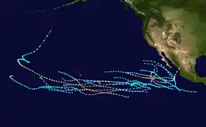 The season began with the formation of Tropical Depression One-E on June 18 and ended with the dissipation of Tropical Depression Nona on October 26.[1] No named systems formed in May, three in June, four in July, five in August, six in September, two in October, and none in November.[1] The total length of the season, from the formation of the first depression to the dissipation of the last, was 130 days.[14]