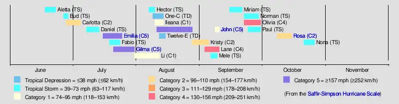 The only named storm to make landfall this year was Hurricane Rosa,[1] which killed four people in Western Mexico[6] and forced over 400 to be evacuated.[7] Other notable storms include Hurricane Olivia, a high-end Category 4 system,[1] the three Category 5 hurricanes Emilia, Gilma, and John. Both John and Hurricane Li existed in two of the three basins (East, and West) of the Pacific Ocean.[8]