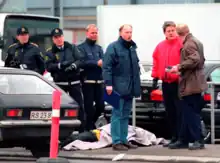 Police at the scene of the shooting. The body of Uffe Larsen lies beneath a white sheet.