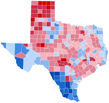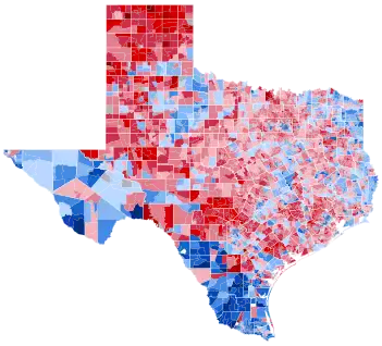 As of the 2020 presidential election, this is the last time a Democratic presidential candidate won the following counties: Hudspeth, Pecos, Terrell, Ward, Swisher, Hall, Cottle, Hardeman, Foard, Baylor, Knox, Haskell, Stonewall, Kent, Dickens, Crosby, Jones, Fisher, Nolan, Mitchell, Menard, Comanche, Palo Pinto, Bastrop, Caldwell, Nueces, San Patricio, Refugio, Bee, Karnes, Atascosa, Burleson, Milam, Falls, Limestone, Navarro, Waller, Grimes, Galveston, Trinity, Orange, Jasper, Tyler, Sabine, San Augustine, Shelby, Panola, Harrison, Marion, Cass, Bowie, Camp, Titus, Red River, Rains, Hopkins, Delta, and Fannin.[3] The 58 counties who have not voted for a Democrat since 1996 are the most from one state in this election -- an election already defined by being the end of white rural Southern support for the Democrats writ large -- and the most from one state since 1976 (also Texas, with 73).