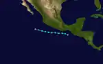 During the third week of August, a tropical disturbance formed far from land. Although the system was located over warmer than average sea surface temperatures, the upper-level environment was initially unfavorable. However the environment gradually became more conducive for tropical cyclone formation and Tropical Depression Twelve-E formed August 25 from an area of disturbed weather in a rather easterly location. It became a tropical storm the next day and a hurricane on August 27. Intensification was rapid, with winds increasing from 75 mph (121 km/h) to 115 mph (185 km/h) in just 6 hours. Continuing to rapidly intensify, it reached its peak intensity as a low-end category 4 hurricane.[26] After maintaining peak intensity for 30 hours, it moved north-northwest and encountered increasing wind shear which reduced its winds from 115 mph (185 km/h) to 35 mph (56 km/h) in just 24 hours. Jimena completely dissipated on August 30, not long after entering the Central Pacific Basin. Hurricane Jimena was of no threat to land.[26]