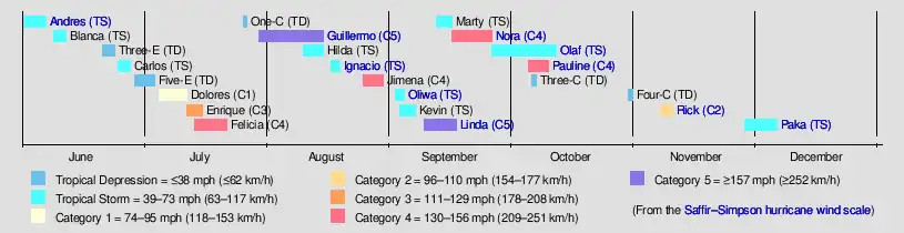 Several storms impacted land. The first was Tropical Storm Andres which killed four people and left another two missing. In August, Tropical Storm Ignacio took an unusual path through the basin, resulting in its extratropical remnants causing minimal damage throughout the Pacific Northwest and California. Linda became the most intense east Pacific hurricane in recorded history, a record it maintained until it was surpassed by Hurricane Patricia in 2015. Although it never made landfall, it produced large surf in Southern California and as a result, five people had to be rescued. Hurricane Nora caused flooding and damage in the Southwestern United States, while Olaf made two landfalls and caused eighteen deaths and several other people were reported missing. Hurricane Pauline killed several hundred people and caused record damage in southeastern Mexico. In addition, Super Typhoons Oliwa and Paka originated in the region before crossing the International Date Line and causing significant damage in the western Pacific. There were also two Category 5 hurricanes: Linda and Guillermo.