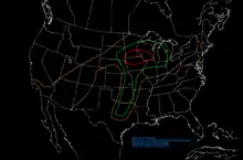 By early afternoon, the low-pressure area had moved east into Nebraska, while the warm front had moved northward into southern Minnesota.[1] The atmosphere to the south of the warm front was strongly capped, meaning that the best chance of thunderstorm development was in areas along and slightly north of the front.[3] By the time the thunderstorms started developing, CAPE values were 2000 J/kg, indicating moderate atmospheric instability.[4] Also present were low-level and deep-layer wind shear values of 44 and 87 knots (51 and 100 mph; 81 and 161 km/h), respectively. All of these factors combined to create very favorable conditions for the development of severe thunderstorms and tornadoes.[1]