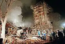 The Russian apartment bombings were a series of explosions that hit four apartment blocks in the Russian cities of Buynaksk, Moscow, and Volgodonsk in September 1999, killing more than 300, injuring more than 1,000, and spreading a wave of fear across the country. The bombings, together with the Invasion of Dagestan, triggered the Second Chechen War.[1][2] The handling of the crisis by Vladimir Putin, who was prime minister at the time, boosted his popularity greatly and helped him attain the presidency within a few months.