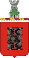 • Crest: On a wreath of the colors Or and Gules, a masonry tower Proper charged with a maple leaf Vert.