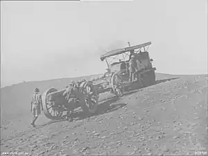 Holt caterpillar tractor towing a 6-inch howitzer in the Middle East, 1918.