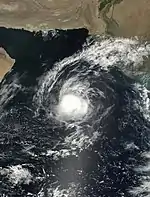 The first storm of the season originated from a tropical disturbance that formed east of Somalia on May 18. Over the following few days, the system gradually organized,[3] becoming a depression on May 21. It moved eastward toward the coastline of southwestern India and rapidly intensified on May 22, strengthening from a deep depression to a very severe cyclonic storm within 24 hours.[1] After approaching the coastline, the storm turned to the north and northwest away from land due to a ridge.[3] Based on the well-defined eye and the storm's satellite presentation,[1] the IMD estimated peak winds of 215 km/h (135 mph) on May 24, and the JTWC estimated 1 minute winds of 205 km/h (125 mph).[4] It became the strongest storm on record in the Arabian Sea, only to be surpassed by Cyclone Gonu in 2007.[5] Soon after reaching peak intensity, the cyclone rapidly weakened as it turned northward. By May 28, it had deteriorated into a deep depression, and the IMD downgraded the storm to a remnant low before the circulation reached the Gujarat coast.[4]