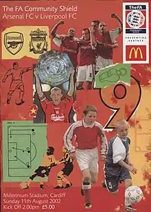 The 2002 FA Community Shield (also known as The FA Community Shield in partnership with McDonald's for sponsorship reasons) was the 80th FA Community Shield, an annual English football match played between the winners of the previous season's Premier League and FA Cup. It was the first edition since the competition's rename from the FA Charity Shield. The match was contested by Arsenal, who won a league and FA Cup double the previous season, and Liverpool, who finished runners-up in the league. It was held at Cardiff's Millennium Stadium, on 11 August 2002. Arsenal won the match by one goal to nil, watched by a crowd of 67,337.