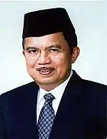 Yudhoyono's running mate was Jusuf Kalla, a wealthy Bugis businessman and member of Golkar who served as Coordinating Minister for People's Welfare under Megawati.[28] He mediated two separate peaceful resolutions to inter-religious conflicts between Christians and Muslims in his native Sulawesi in 2001 and Maluku in 2002.[29][30] Kalla joined Golkar's selection process for the party's presidential nominee in August 2003 but withdrew his candidacy days before the party convention the following April.[31][32] Several days later, he resigned his cabinet position and announced his alliance with Yudhoyono.[28] Kalla was also seen as a potential vice-presidential candidate for the incumbent Megawati.[33]