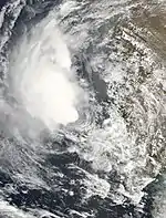 After developing, the system moved northwestward due to a ridge over India.[25] The IMD upgraded the depression to Cyclonic Storm Agni late on November 29 and further to a severe cyclonic storm the next day.[1] The JTWC also upgraded Agni to the equivalent of a minimal hurricane, estimating 120 km/h (75 mph). Wind shear and dry air caused the storm to weaken.[25] After Agni turned westward, the IMD downgraded it to a depression and later remnant low on December 2,[1] although the JTWC tracked it for another day, issuing their final advisory while Agni was about 450 km (275 mi) south-southeast of Cape Guardafui—the easternmost point of the Horn of Africa.[25] The remnants moved ashore at eastern Somalia, before turning to the south and dissipating on December 5.[2]