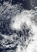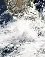 In mid-September, a series of tropical waves entered the eastern Pacific from the Caribbean Sea. One of these waves led to the formation of a tropical depression by 12:00 UTC on September 17, which intensified into Tropical Storm Lidia and attained peak winds of 40 mph (65 km/h) six hours later.[42] Initial forecasts were of low confidence, with forecasters citing uncertainty in whether Lidia or a developing disturbance to its east would become the dominant cyclone.[43] Nearly stationary, the cyclone's cloud pattern soon became distorted by the much larger circulation of developing Tropical Storm Max. Lidia weakened to a tropical depression late on September 18 and was completely absorbed by Max twelve hours later.[42]