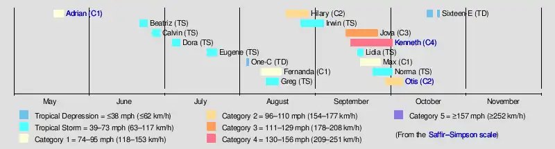 Activity began with the formation of Hurricane Adrian, the fourth-earliest-forming tropical storm on record in the basin at the time. Adrian led to flash flooding and several landslides across Central America, resulting in five deaths and $12 million (2005 USD) in damage. Tropical storms Calvin and Dora caused minor damage along the coastline, while Tropical Storm Eugene led to one death in Acapulco. In early October, Otis produced tropical storm-force winds and minor flooding across the Baja California peninsula. The remnants of Tropical Depression One-C in the central Pacific, meanwhile, caused minor impacts in Hawaii. The strongest storm of the season was Hurricane Kenneth, which attained peak winds of 130 mph (215 km/h) over the open Pacific.