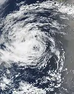 In late July to early August, an organized thunderstorm cluster persisted within the Intertropical Convergence Zone (ITCZ). Upon further development, the disturbance was designated as a tropical depression as it tracked swiftly west, the first and only cyclone to form in the central Pacific throughout the season. Despite initial forecasts of a minimal tropical storm, increasing wind shear and cooler ocean temperatures prompted the depression to instead dissipate by 00:00 UTC on August 5, having only attained peak winds of 30 mph (45 km/h).[25]