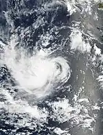A tropical wave emerged off the western coast of Africa on June 11, remaining inconspicuous until reaching the southwestern Caribbean Sea eight days later. The system entered the eastern Pacific on June 21, where steady organization led to the formation of a tropical depression around 06:00 UTC on June 26 while located 330 mi (530 km) south-southeast of Acapulco, Mexico. Upon formation, the cyclone moved north-northwest and then west-northwest under the dictation of a subtropical ridge to its north. It intensified into Tropical Storm Calvin at 18:00 UTC on June 26, attaining a peak intensity of 50 mph (85 km/h) early the next morning in conjunction with a well-defined spiral band on radar.[16][17] Calvin then dove west-southwest and weakened as strong wind shear exposed the storm's circulation; it fell to tropical depression status at 12:00 UTC on June 28 and further degenerated to a remnant low by 06:00 UTC the next day. The low moved generally westward before dissipating well southwest of the Baja California peninsula on July 3.[16] As a tropical cyclone, Calvin caused only minor damage to roofs and highways, flooded a house, and toppled two trees.[18]