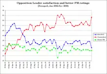 Beazley's Newspoll ratings for 2005–2006. Blue shows satisfaction, red shows dissatisfaction and green shows preferred PM rating.