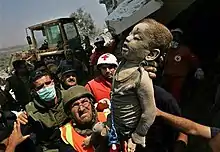 The 2006 Qana airstrike (also referred to as the 2006 Qana massacre[3][4] or the second Qana massacre[5][6]) was an airstrike carried out by the Israeli Air Force (IAF) on a three-story[7] building in the small community of al-Khuraybah near the South Lebanese village of Qana on July 30, 2006, during the 2006 Lebanon War. The strike killed 28 civilians, 16 of whom were children.[8][9] Israel halted airstrikes for 48 hours following the attack, amid increasing calls for a ceasefire in the conflict between Israel and Lebanon's Hezbollah guerrillas.[10]