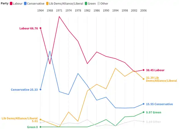 ![]() Map of the results of the 2006 Southwark council election. Conservatives in blue, Greens in green, Labour in red and Liberal Democrats in yellow. | ||||||||||||||||||||||||||||||||||||||||||||||||||||||||||||||||||||||||||||||||||