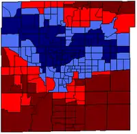 Voting by party by neighborhood. The darkest blue shade represents more than 60% of votes were for Peterson, the lighter blue shade represents more than 50% for Peterson. The darkest red shade represents more than 60% of votes were for Ballard, the lighter red shade represents more than 50% for Ballard.