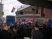 On February 21, a very large demonstration called Kosovo is Serbia (Косово је Србија, Kosovo je Srbija) was held in Belgrade in front of the Parliament organized by the Serbian government, with up to hundreds of thousands people attending it.[15] Speakers at the protest were: Prime Minister Vojislav Koštunica, opposition leader Tomislav Nikolić, Republika Srpska Prime Minister Milorad Dodik, Montenegro opposition leader Andrija Mandić, Montenegro opposition politician Predrag Popović, basketball player Dejan Bodiroga, filmmaker Emir Kusturica, tennis player Novak Djokovic (via link), actors Ivana Žigon, Nenad Jezdić and Nataša Tapušković, and Yugoslav crown prince Alexander Karađorđević.