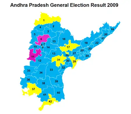 The 2009 Indian general election polls in United Andhra Pradesh were held for 42 seats in the state.[1] The major contenders in the polls were the Third Front, Indian National Congress and Praja Rajyam. The assembly elections were held simultaneously with the general elections in the state.