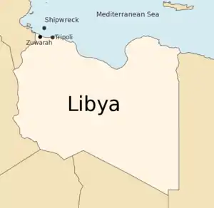 One vessel was confirmed by Libyan authorities to have capsized. It was a wooden fishing boat with a legal capacity of 50 persons and was attempting a crossing from Libya to Italy while carrying around 250 migrants.[1] The boat set off from Sidi Bilal, near Tripoli, where survivors have said that it was already in a poor condition and possibly holed.[1][2] The vessel is thought to have capsized 30 miles (48 km) off the Libyan coast on 27 March 2009 in high winds and seas.[1] A search and rescue attempt was made on 29 March by the Libyan Navy, Italian Navy and local fishing boats, which recovered 21 people alive from the upturned boat and a further 23 bodies.[1][3] At least 10 Egyptians and 10 Gambians were among the dead, along with Tunisians, Palestinians and Nigerians.[2][4][5] Those rescued were returned to Tripoli and 17 were admitted to hospital for treatment.[1] A further 77 bodies washed ashore on beaches to the west of Tripoli, including at Sebrata, on 31 March, the same day that search and rescue efforts were called off and the Libyan authorities made the news public.[1][3][6] The remaining passengers were listed as missing, presumed dead.[1]