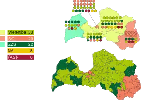 A total of 1,239 candidates representing 13 parties or alliances stood in five electoral constituencies equivalent to the four regions of Latvia and Riga city. With 1012 of 1013 polling stations counted, results showed an increase in support for the incumbent coalition government of Valdis Dombrovskis, with 58% of the vote and 63 of the 100 seats.[4]
