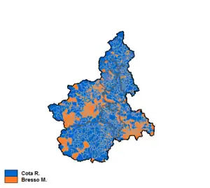 Cota, who is a republican and has no nostalgia of the House of Savoy, said his message would do well in Piedmont and that he would overcome the weakness of Lega Piemonte that usually gets far fewer votes than Liga Veneta in Veneto and Lega Lombarda in Lombardy. In Cota's view, most of his support would come from industrial workers, including those of Southern Italy descent, and Catholics embarrassed by Bresso's secularism.[2] The Union of the Centre, whose main aim in the election was to fight back the Northern League, chose to support Bresso, turning down the chance of running its own candidate, the most likely being Michele Vietti.[3] Most Catholic voters disagreed.