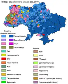 The 2010 Ukrainian local elections took place on 31 October 2010,[1] two years before the 2012 general election. The voter turnout across Ukraine was about 50%, which is considered low in comparison to previous elections.[2]