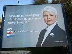 One of HDZ campaign posters featuring Jadranka Kosor. The slogan Best when things are tough is positioned below the party's logo.