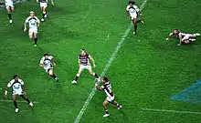 Manly started the month of May with a home win over the lowly Canberra Raiders in which Brett Stewart scored his 99th, 100th and 101st tries for the Sea Eagles.[15] It was the first in a six-match winning streak, as Manly then defeated the Gold Coast, Brisbane, Canterbury, North Queensland and arch-rivals Parramatta. The run of wins took the team to second on the NRL ladder.[16] It also helped Manly's players with representative ambitions. Four Sea Eagles featured in the mid-season State of Origin series: Jason King, Anthony Watmough, Glenn Stewart, and, at the age of 19, William Hopoate, who scored a try in his first match for New South Wales and followed his father John in playing for both Manly and his state.[17] At the time, Hopoate announced that he would be leaving professional football at the end of the season to embark on a two-year mormon mission.[18]