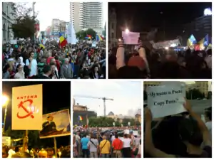 ![]() Clockwise, from top: Protest against the Roșia Montană Project in Bucharest, demonstration against president Traian Băsescu in January 2012, protester holding a message against prime minister Victor Ponta, mass gathering in University Square against Băsescu, placards depicting messages against Ponta and Antena 3 | ||||