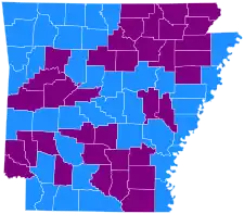 | Arkansas | 54.11% (599) | 45.89% (508) | Garland | 70.46% (2647) | 29.54% (1110) | Newton | 74.60% (94) | 25.40% (32) | |||||||