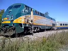 The train, Via Rail #51 (pulled by General Electric P42 Genesis locomotive #915), departed Ottawa at 8:32 a.m., bound for Toronto. The bus, OC Transpo Route 76 (an Alexander Dennis Enviro500 double-decker #8017), had just departed from Fallowfield Transitway Station with 83 people aboard.[7][8] The crossing's gates, lights, and bells engaged 47 seconds before the crash, and its gates were fully horizontal across the road 25 seconds before the crash.[5] The train rang its bell but did not sound its whistle, due to a municipal whistle ban in effect between 8:00 p.m. and noon.[7] The train was travelling at 75 kilometres per hour (47 mph) at the time of the collision – below its speed limit of 161 km/h (100 mph) – and its emergency brakes were applied 2 seconds prior to the collision.[5][7] The bus was travelling at 67.6 km/h (42.0 mph) – above its speed limit of 60 km/h (37 mph) – before its brakes were applied,[8] which occurred 3 seconds before the crash; the full force of the brakes was not initially applied.[8] The collision sheared off the front end of the bus and derailed the train.[1][6]