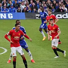 After the international break, United's next opponents were league strugglers Aston Villa at Old Trafford on 4 April 2015. United won the match 3–1 with a brace from Ander Herrera and a goal from Wayne Rooney to move up to third in the Premier League table.[18] On 12 April 2015, United claimed their first Manchester derby win since 2012 over neighbours Manchester City – a stunning 4–2 victory with goals from Young, Fellaini, Mata, and Smalling.[19] United failed to extend their winning run, and suffered their first defeat in six games to league leaders Chelsea.[20] United then suffered their second straight defeat the following week, in a 3–0 loss to Everton. This meant the Red Devils had failed to win at Goodison Park for the third season running.[21]
