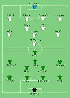 Guinea took the lead in the 36th minute when Mohamed Yattara smashed home a headed clearance from the Ivory Coast defence. Gervinho was sent off in the 58th minute for hitting Naby Keïta in the face, but the 10-men Ivory Coast equalized in the 72nd minute, as Wilfried Bony controlled the ball on his chest and passed to Seydou Doumbia to score.[5][6]