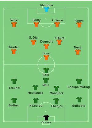 The only goal of the match was scored by Max Gradel in the 35th minute, as he stole the ball from the Cameroon defence, dribbled inside and shot home from outside the penalty area. The win sent Ivory Coast to the quarter-finals as group winners, while Cameroon were eliminated.[17][18]