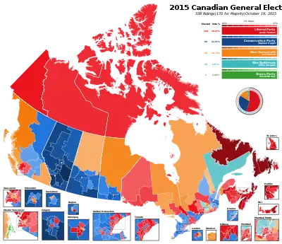 The 2015 Canadian federal election held on October 19, 2015, saw the Liberal Party, led by Justin Trudeau, win 184 seats, allowing it to form a majority government with Trudeau becoming the next prime minister.