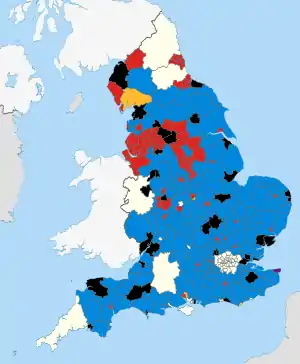 - ↑ The English local government bodies which did not hold local elections were seven unitary authorities (Cornwall, Durham, the Isle of Wight, Northumberland, Isles of Scilly, Shropshire and Wiltshire), seven district and borough councils (Adur, Cheltenham, Fareham, Gosport, Hastings, Nuneaton and Bedworth and Oxford), and the 32 London boroughs.