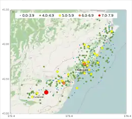 | 14 November 2016 | 09:22:14 | 5.0 | 27 km (17 mi) | 15 km northeast of Kaikōura | [135] |